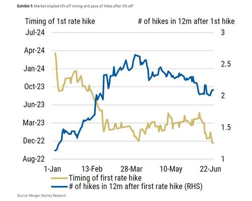 而相比之下,市场预期中值目前仅预计在首次加息后的头12个月里,美联储会再加息2.1次。