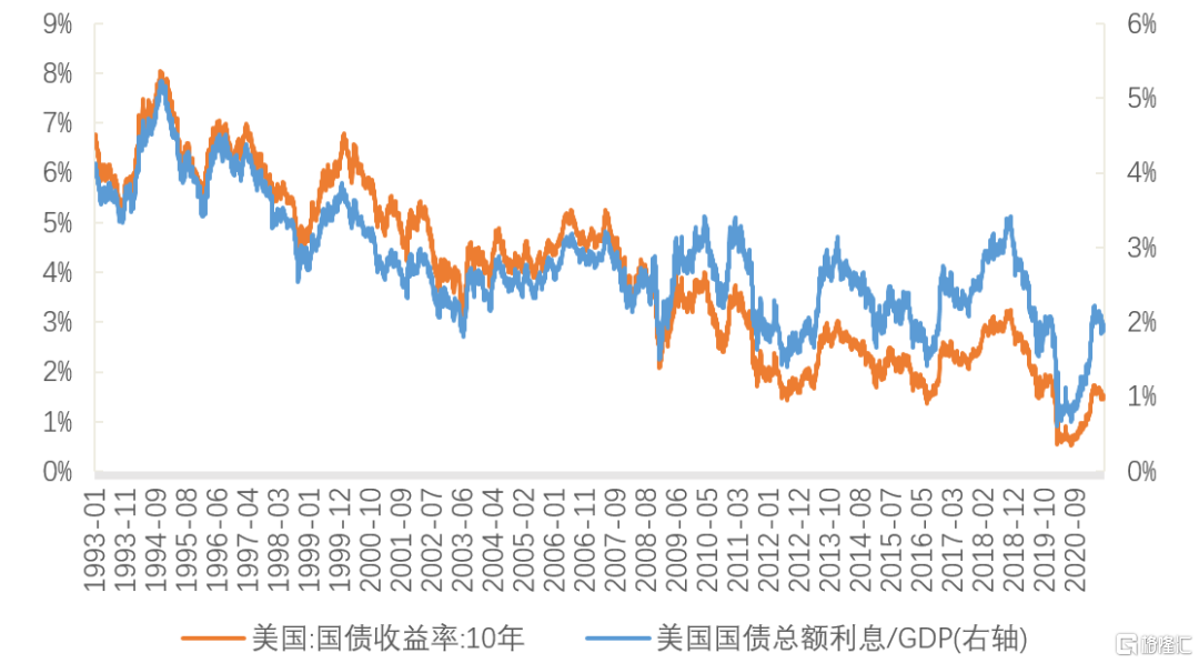 图7:美国存量国债的利息比GDP(对应利率水平)