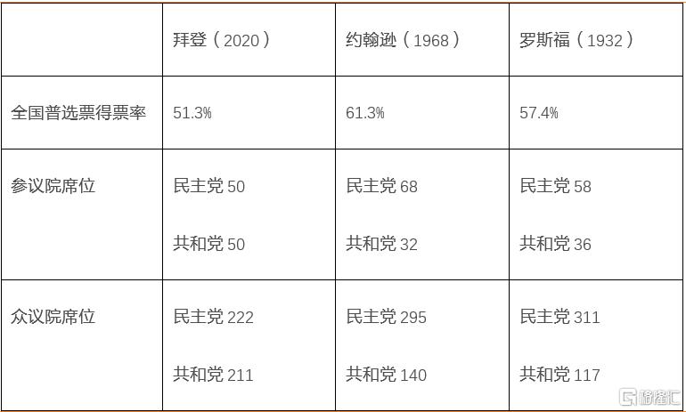 表1:拜登 vs 约翰逊(1964)vs 罗斯福(1933)的选票得票率,参众两院控制的席位耐用品消费