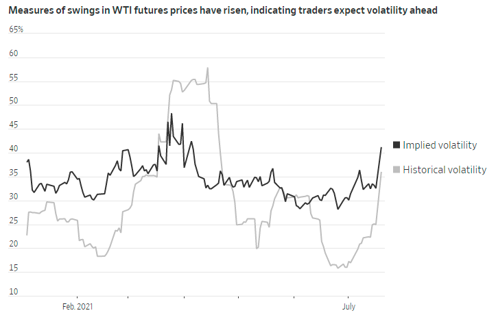 衡量交易员对未来30天WTI原油价格波幅预期的隐含波动率指标周一跃升至了41.2%。据QuikStrike的数据,这是4月5日以来的最高水平。该指标曾在2020年4月创下345%的历史峰值,当时全球范围内的疫情封锁导致原价史无前例地跌入了负值。