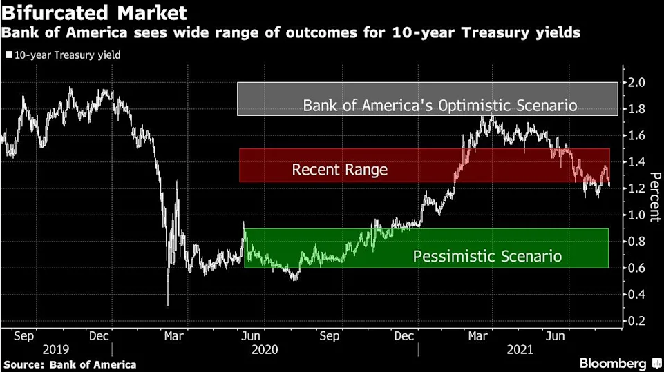对于美债收益率的后市走向,美银策略师周二发布报告预计,指标10年期美债收益率年底前既有可能从目前约1.27%的水平跌破1%,也有可能飙升至2%。而就眼下而言,在通胀路径、德尔塔变种影响和美联储的政策反应变得清晰之前,收益率可能会保持在近期的交易区间内。