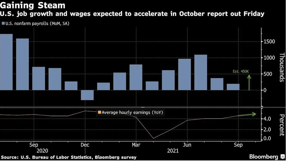 目前,接受媒体调查的经济学家预计,随着越来越多的美国人重返劳动力市场,招工竞争放缓,未来几个月工资成长将放缓。预计劳工部周五发布的报告将显示美国10月新增就业45万,为7月以来最高。此前,9月的非农数据仅增加19.4万,为九个月来最低增幅。