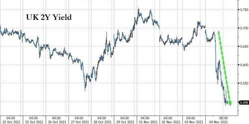 对利率预期最敏感的2年期英债收益率当天一度急跌逾20个基点,盘中触及四周低点0.475%。这是自2016年6月24日英国脱欧公投后的第二天以来最大的单日跌幅,5年期英债收益率也骤降19个基点,至0.65%。