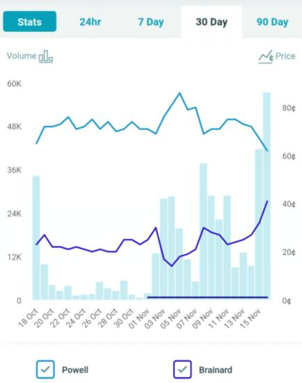 美国政治博彩网站的数据显示,在本周三鲍威尔和布雷纳德获胜的差距一度收窄至了“六四开”,这也令市场人士愈发开始正视起布雷纳德后来居上的可能性。布雷纳德被认为比鲍威尔更鸽派,在收紧政策之前,更有可能让通胀持续在高位更长时间。