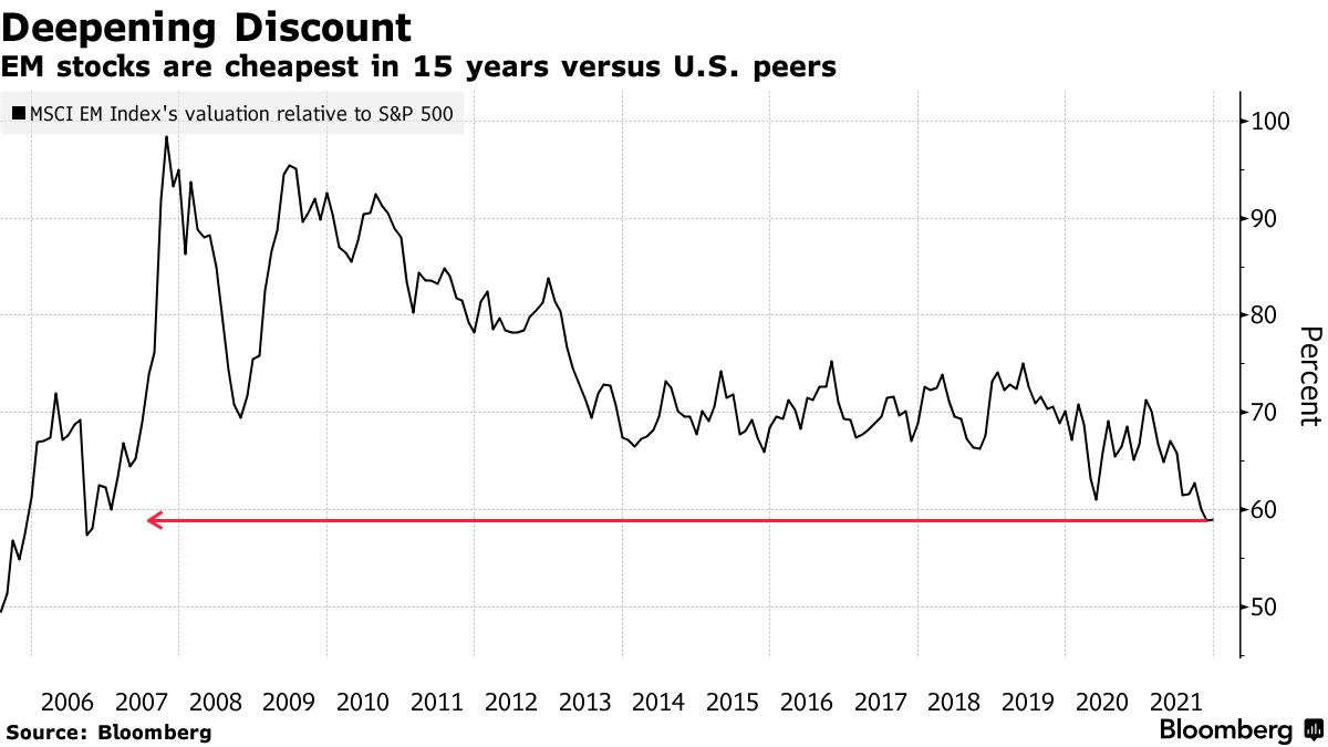 与美国市场相比,新兴市场中的股票是15年来最便宜的