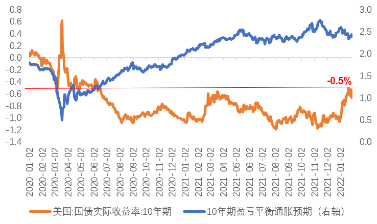 图2:实际利率触及-0.5%,创下2020年7月以来的新高(单位:%)