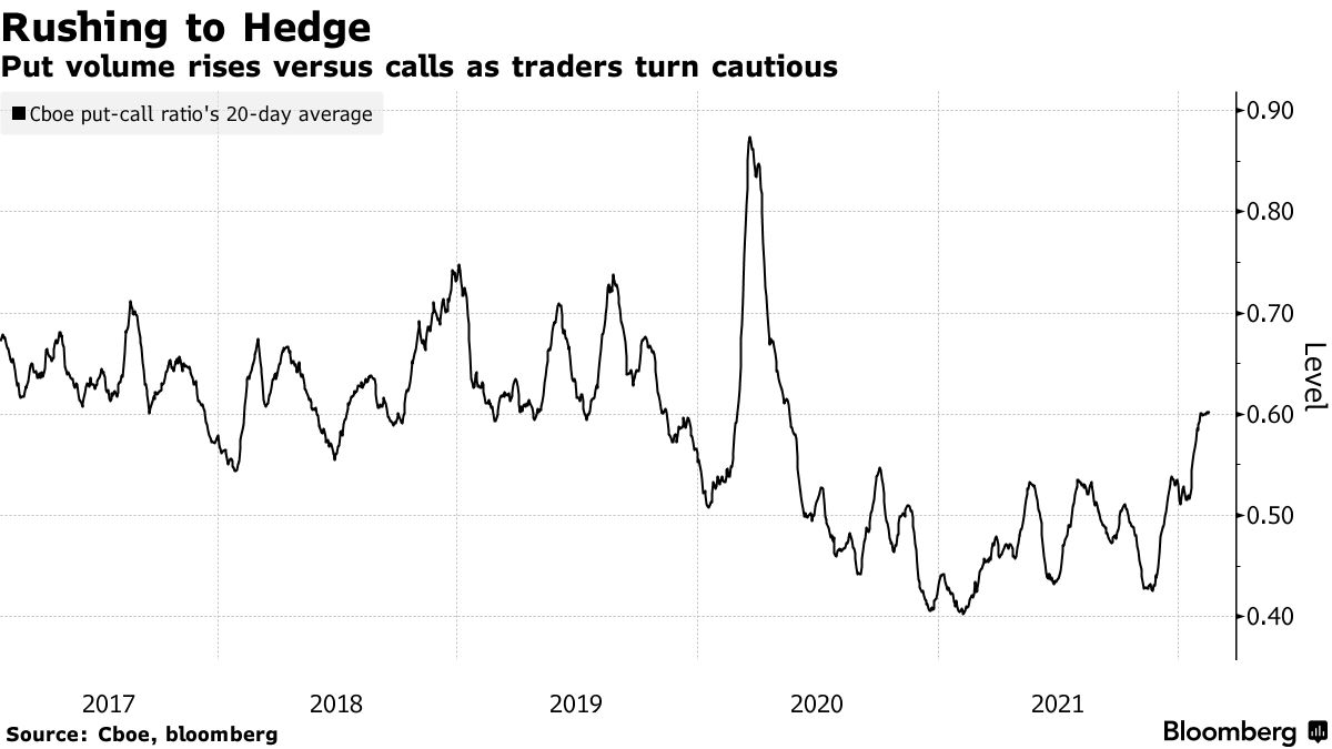 尽管看涨合约一度是meme人群的首选工具,但因为预计美联储将在3月份进行三年来的首次加息,投资者对看跌期权的需求一直在增长。在新的一年里,各种资产遭到抛售,标普500指数ETF的未平仓头寸攀升至两个月来的高点,而iShares iBoxx高收益公司债券ETF的未平仓头寸则飙升至创纪录水平。