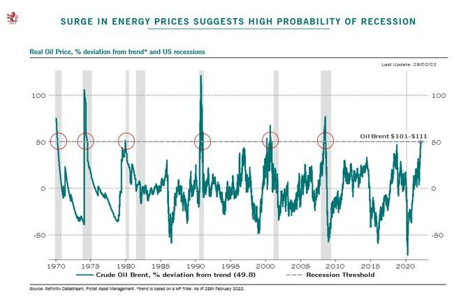 从历史上看,并不是每一次经济衰退都是由油价上涨50%引起的,然而每当油价上涨50%,就几乎铁定会导致经济衰退。