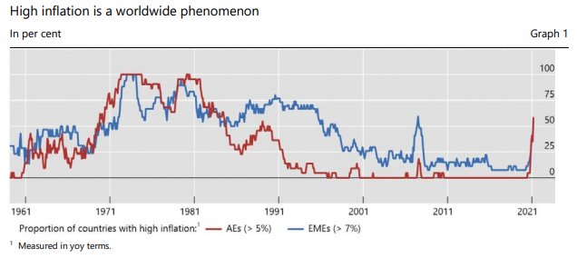 根据国际清算银行的统计,不断飙升的全球能源和食品价格意味着,近60%发达经济体的通胀率同比涨幅超过5%,这是自上世纪80年代末以来的最高水平,而一半以上的发展中国家的通胀率超过7%。