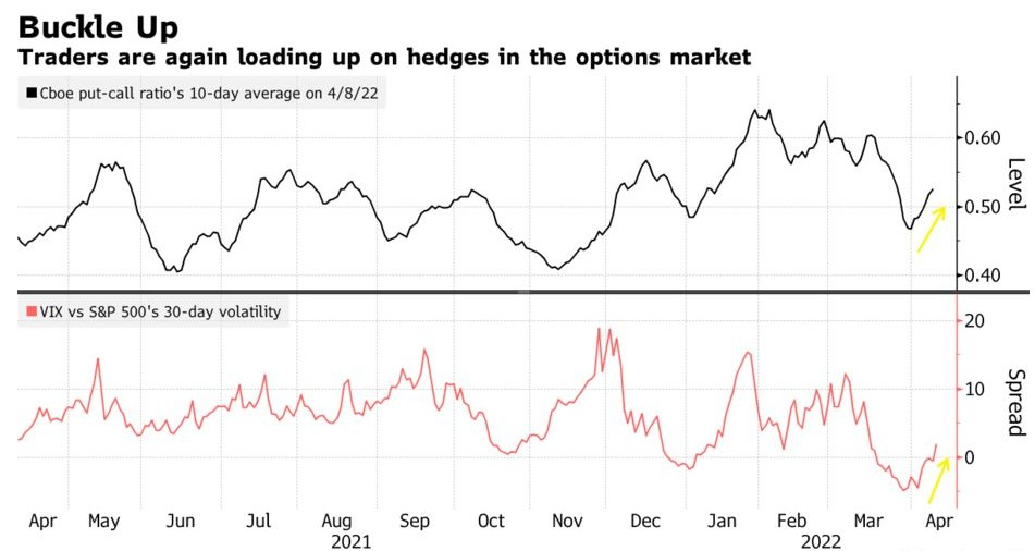 随着主权债券失宠,一群投资者开始寻求持有现金避险。美国银行3月份对基金经理的调查显示,现金持有量升至2020年4月以来的最高水平。在3月份反弹期间削减对冲头寸后,交易员们也在重新配置期权市场的对冲保护措施。衡量标普500期权价格的VIX波动率指数本月已上涨3.62点,至24.18点,罕见低于标普500期权的30天实际波动率。与此同时,芝商所单只股票看跌/看涨期权成交量比率的20日均值也从四个月低点上扬。