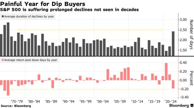 2022年至今,标普500指数的跌势平均持续大约2天半,是1974年以来最久的一年,而下跌后的回报率为-0.2%,同样是近50年来最糟糕的。