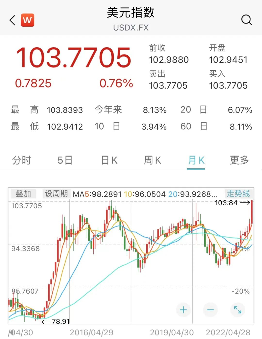 美元指数盘中触及103.84,创下2002年末以来的新高。自4月初以来,美元指数已上涨约5%,今年累计上涨超过7%。