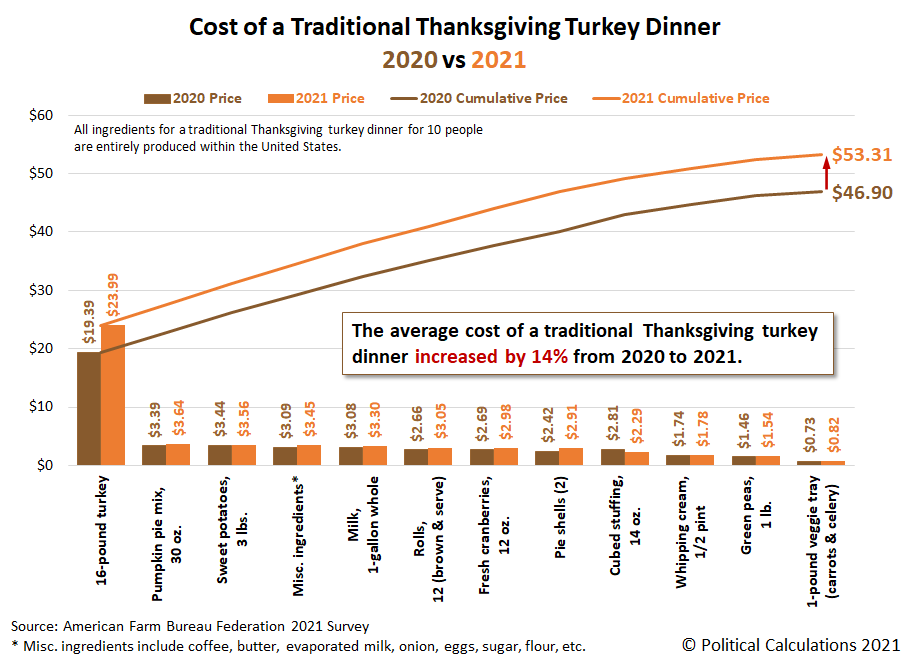 其中,感恩节大餐“主角”火鸡的价格涨幅最为明显。一只16磅重的火鸡价格从2020年的19.39美元,上涨到今年的23.99美元,涨幅达4.60美元(24%),单是火鸡就占了晚餐总成本同比增长的72%。