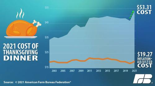 根据美国农场局联合会(American Farm Bureau Federation)的年度调查,今年经典的10人感恩节火鸡大餐平均费用将高达53.31美元,为有史以来最贵,这一数字将比去年高出14%。