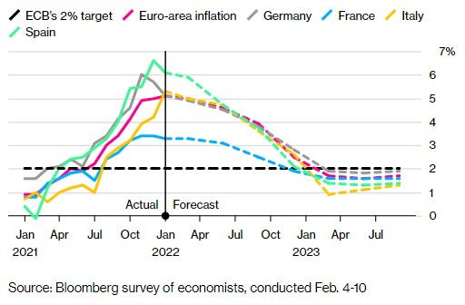 如今,欧洲央行在12月的预测显示,2023年和2024年的通胀率均为1.8%。但今年欧元区1月份通货膨胀率出人意料地飙升至创纪录的5.1%,这显然让市场非常担心,以至于他们不得不重新考虑货币政策的方向。