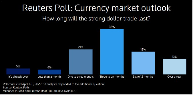 另外,在回答另一个问题的分析师中,超过三分之二(53人中有37人)表示,美元强势将至少再持续三个月,其中17人则认为将持续六个月以上。而13名受访者认为不会超过三个月,其余3人表示涨势已经结束。