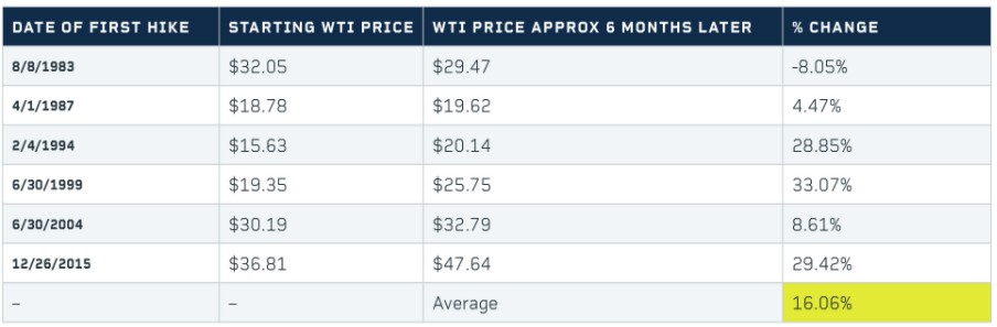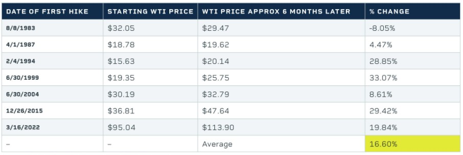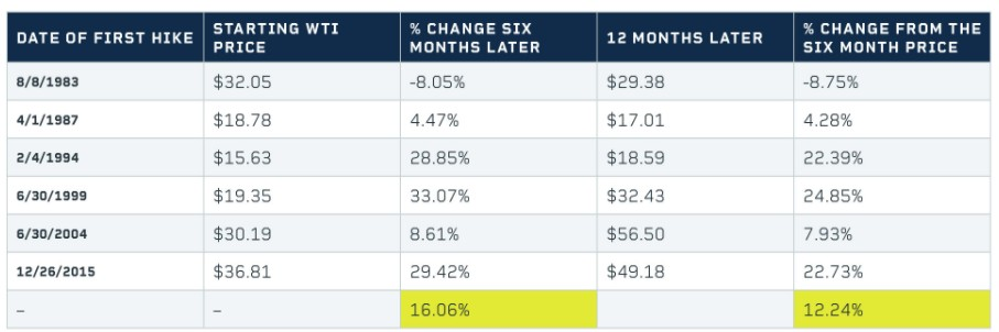 在理论上,美联储加息会使得美元走强,进而会让大宗商品价格走低;然而,从下面的图表来看,利率上升似乎只会对原油价格产生轻微的影响,至少在中期是这样。自1983年以来的每轮周期第一次加息后的12个月里,原油价格以6个月为基准平均上涨了12.24%。
