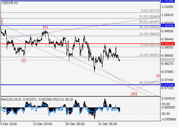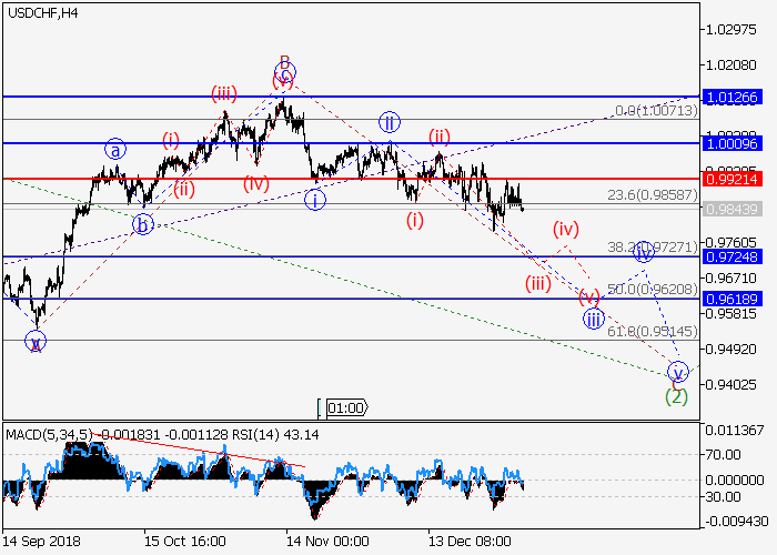 4小时图中,较高水平的下行修正发展为波(2),其中(2)的波C形成。目前,C的第三波iii正在发展,其中,iii的较低水平(iii)正在形成。如果假设正确,该货币对将跌至0.9724–0.9618。该情况的关键止损水平为0.9921。