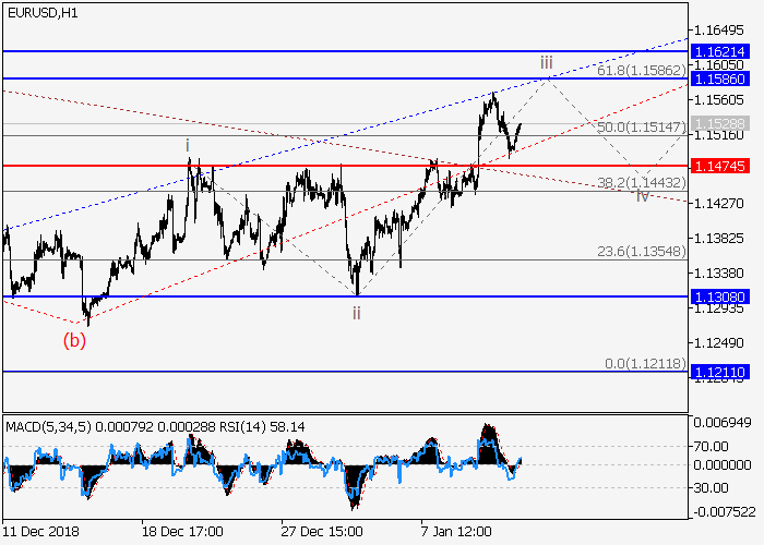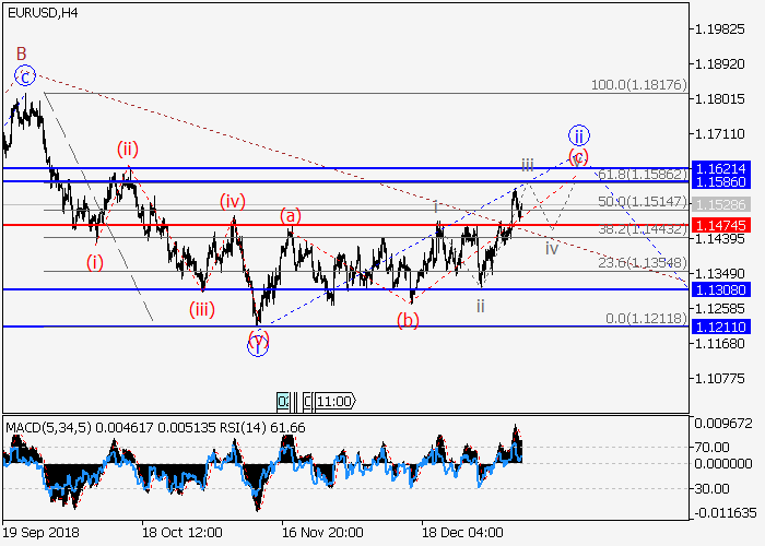4小时图中,较高水平的上行修正发展为(2)的C的波ii。目前,ii的波©正在形成,其中,(c)的较低水平iii的第三波正在发展。如果假设正确,价格将会升至1.1586–1.1620。该情况的关键止损水平为1.1474。
