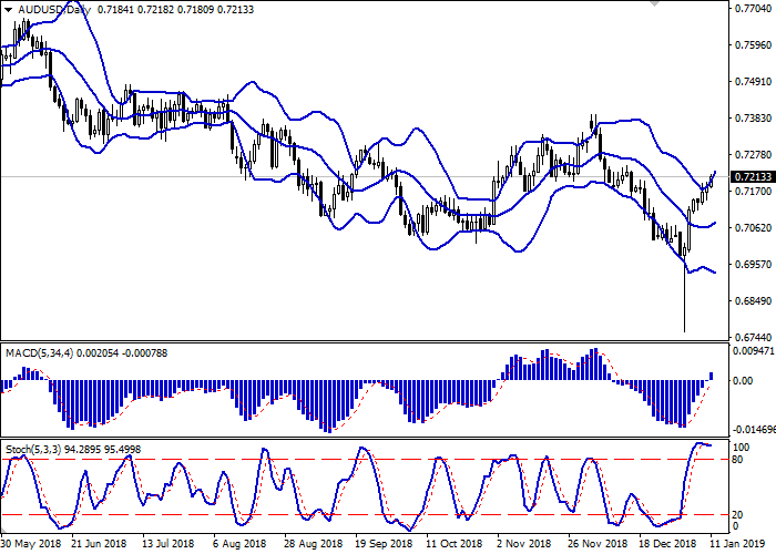 日线图中,布林带显示稳定上涨。价格区间积极扩大,为“看多”势头通向局部新高腾出通道。平滑异同移动平均线(MACD)指标上涨,保持稳定的买入信号(位于信号线以上)。指标也试图在零线以上盘整。随机指标已达到其高点,反转进入水平平面,表示澳元有超买风险。
