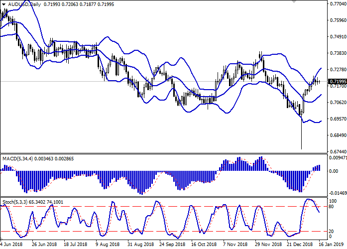 日线图中布林带呈适度增长。价格区间仍有扩大的趋势,为“多头”打开了通往局部新高的通道。平滑异同移动平均线(MACD)指标增长保持相当稳定的买入信号(位于信号线上方)。随机指标保持下降趋势,表明短期和/或超短期内澳元有超买相关风险。