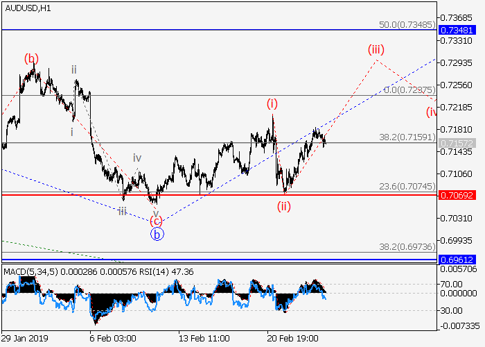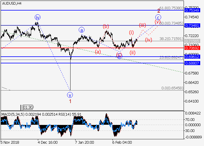 4小时图中,较高水平的上行修正发展为(5)的波2。目前,2的波c正在形成,其中,c的波(iii)正在发展。如果假设正确,价格将会升至0.7348水平。该情况的关键止损水平为0.7069。