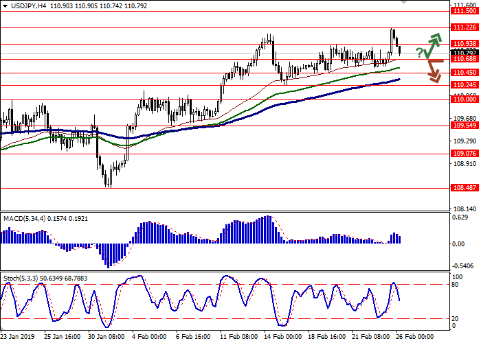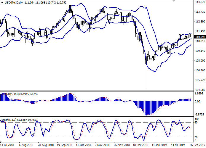 日线图上,布林带稳步增长。价格区间收窄,反映出短期内交易的模糊性。平滑异同移动平均线(MACD)指标在增长,保持较弱的买入信号(图柱位于信号线上方)。在2月26日的亚洲市场中,由于出现了“熊市”趋势,随机指标出现了下跌,这表明出现了修正趋势的风险。