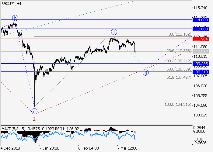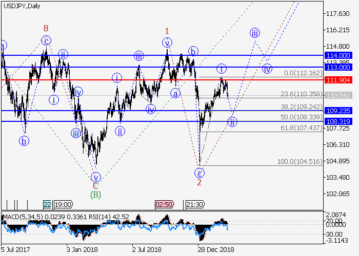 日线图中,(C)的较高水平3的第三波在发展,其中3的波i已形成。目前,下行修正已开始发展为3的波ii。如果假设正确,该货币对将会跌至109.23–108.31。该情况的关键止损水平为111.90。