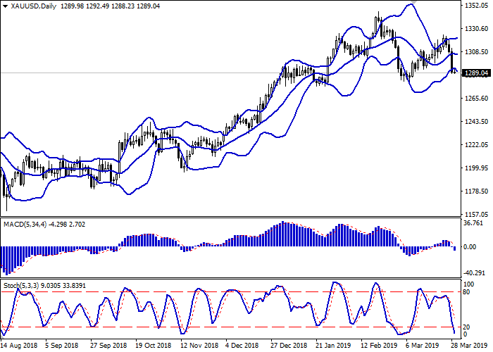 日线图中,布林带平缓移动。价格区间略有扩大,但与市场动态并不相符。平滑异同移动平均线下跌,保持强卖出信号(图柱位于信号线以下)。随机指数几乎垂直下跌,表明超短期内形成了强烈的“看跌”冲动。