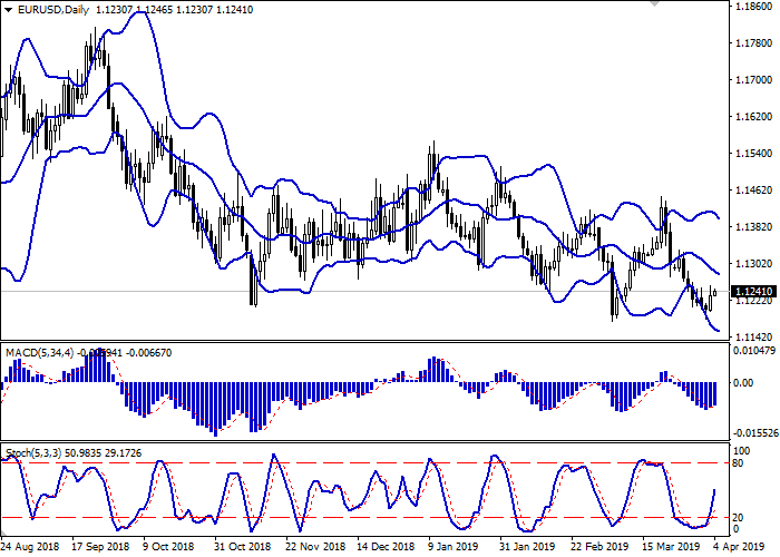 日线图中,布林带呈平面动态。价格区间实际上没有变化,但考虑到市场交易动态,仍相当宽敞。平滑异同移动平均线指标下降,但仍保持上行信号(图柱位于信号线上方)。随机指数已达到其最大值,目前即将向下逆转,表明有出现修正性下跌的风险。