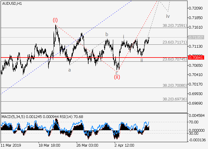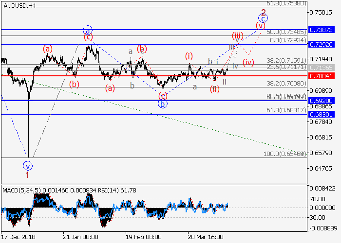 4小时图中,较高水平的上行修正发展为(5)的波2。目前,2的波c正在发展,其中较低水平的c的波(i)已形成,c的局部修正(ii)已结束。如果假设正确,价格将再c的波(iii)中升至0.7292–0.7387水平。该情况的关键止损水平为0.7084。