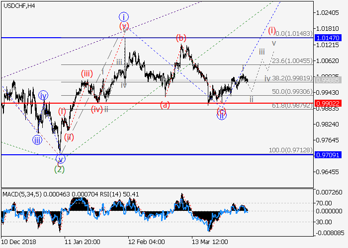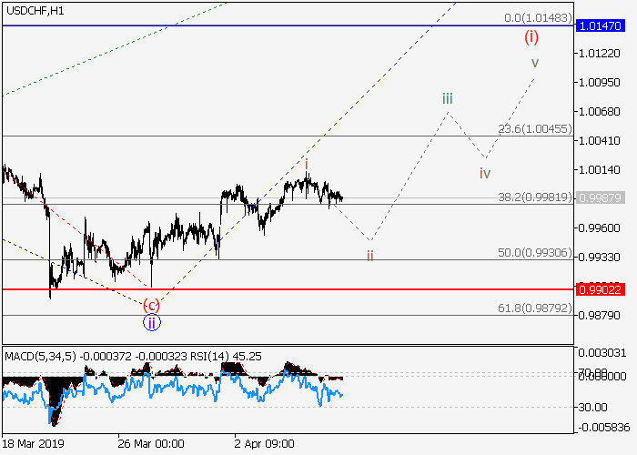 4小时图中,较高水平(3)的第三波发展,其中(3)的1的修正波ii正在收尾。目前,(3)的1的较低水平iii的第三波正开始,其中,iii的较低水平(i)的第一波正在形成。如果假设正确,价格将会升至1.0147–1.0300。该情况的关键止损水平为0.9902。