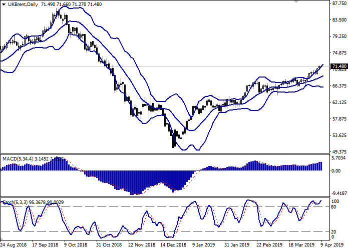 日线图布林带带呈稳定增长趋势。价格区间不断扩大,未及上涨趋势,这就给修正下降的发展带来了额外的风险。平滑异同移动平均线指数正在增长,保持弱买入信号(图柱位于信号线上方)。随机保持不确定的“看涨”动态,但位于接近其最大水平,这表明超短期内原油超买的风险日益增加。