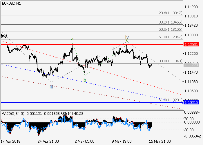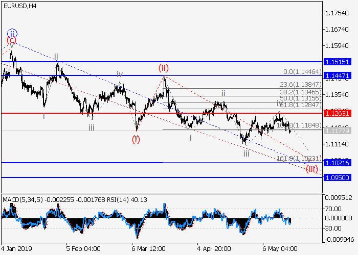 4小时图中,(2)的C的较高水平iii的第三波形成。目前,较低水平的iii的波(iii)正在发展,其中(iii)的局部修正iv已结束,(iii)的波v已开始。如果假设正确,价格将会跌至1.1020–1.0950。该情况的关键止损水平为1.1263。