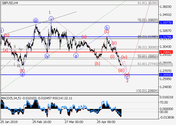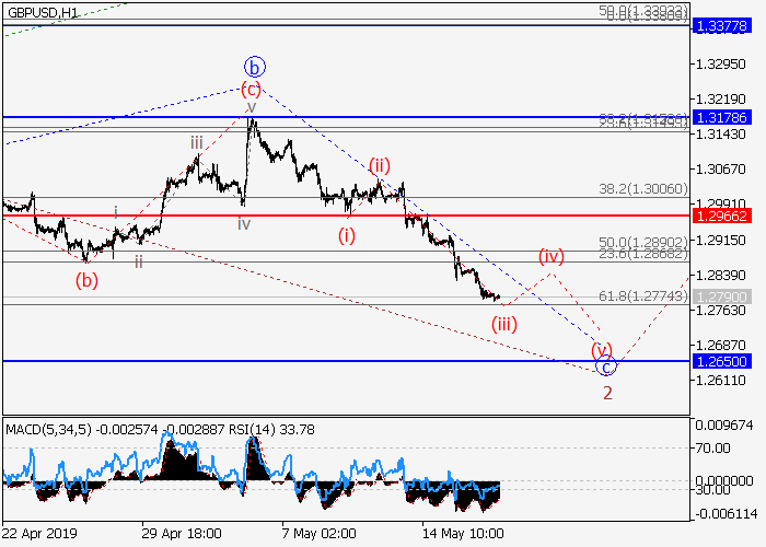 4小时图中,(3)的较高水平1的第一波已形成楔形,下行修正发展为(3)的波2。目前,2的波c正在形成,其中c的较低水平(iii)的第三波已结束。如果假设正确,c的局部修正(iv)后,价格将会跌至1.2650水平。该情况的关键止损水平为1.2966。