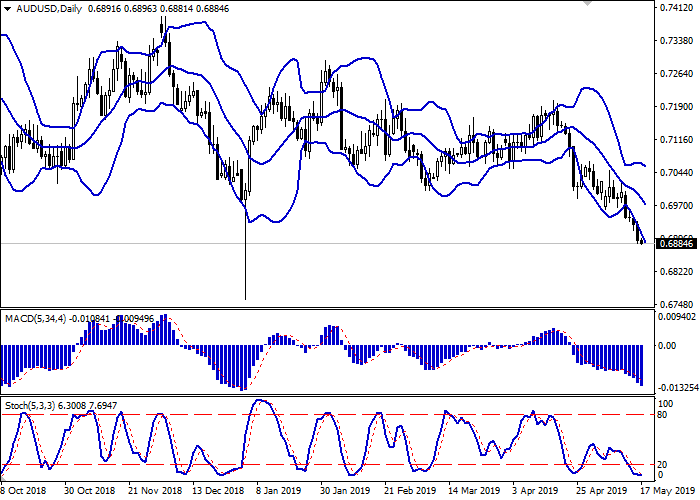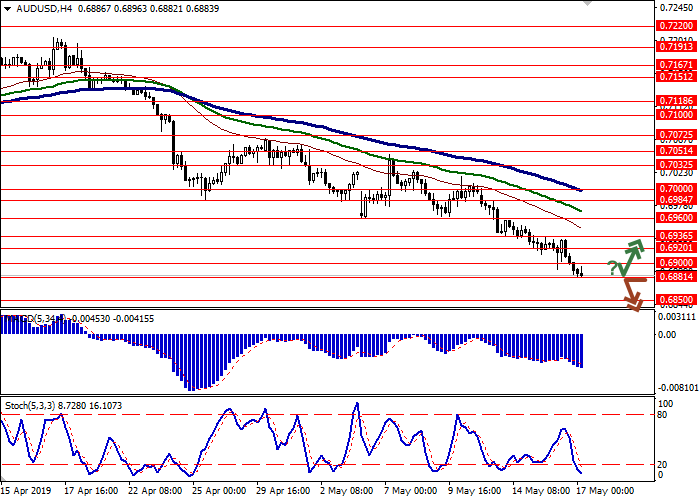周四澳元兑美元汇率稳步下跌,刷新了1月3日以来的低点。澳大利亚劳动力市场报告数据模棱两可,助长了“看跌”情绪。尽管4月份就业稳步增长(28.4万,低于此前预测的14万),但该报告指出,失业率出人意料地从5.1%升至5.2%,这可能给澳大利亚央行在放松货币政策方面带来压力。此外,澳元对美中贸易冲突加剧做出了负面反应。美国政府再次提请外界关注中国的华为,并将其列入黑名单,这可以解释为对技术产品供应的下一个进口限制。