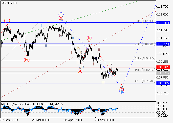 4小时图中,下行修正发展为3的波ii,呈Z字型。目前,ii的波(c)正形成动量,其中ii的(c)的第五波v正在发展。如果假设正确,价格将会跌至107.50。该情况的关键止损水平为108.80。