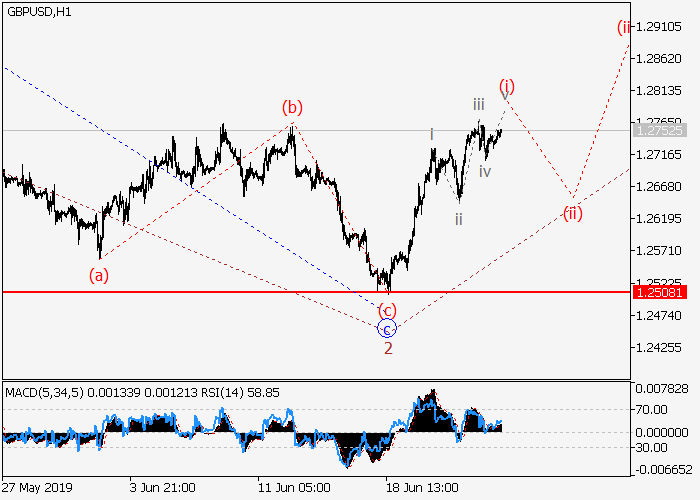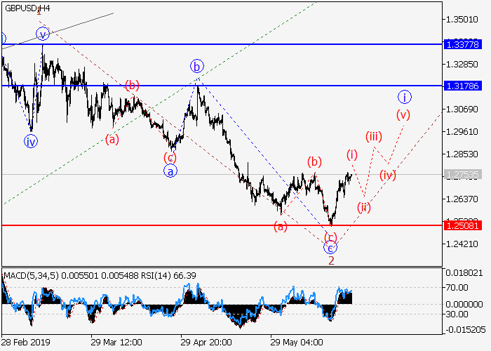 4小时图中,下行修正已发展为(3)的波2。目前,(3)的第三波3正开始发展,其中3的i的较低水平(i)的第一个入市波正在形成。如果假设正确,价格将会升至1.3178–1.3377。该情况的关键止损水平为1.2508。