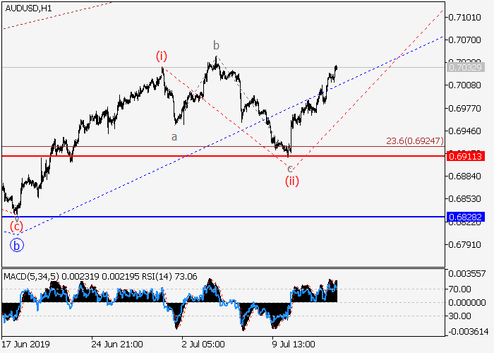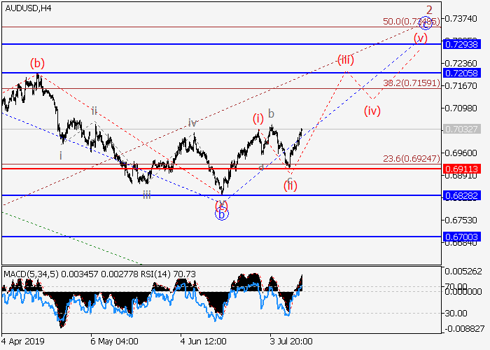 4小时图中,较高水平的修正发展为(5)的第二波2,其中,2的波c开始形成。c的下行修正(ii)已结束,c的第三波(iii)已开始发展。如果假设正确,该货币对将升至0.7205–0.7293。该情况的关键止损水平为0.6911
