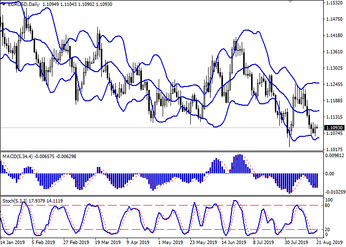 日线图中,布林带呈平面动态。价格区间也保持在一个非常大的区间内。平滑异同移动平均线向上反转,保持卖出信号(位于信号线下方)。随机指数也表现出类似动态,即将离开其下区,形成买入信号。