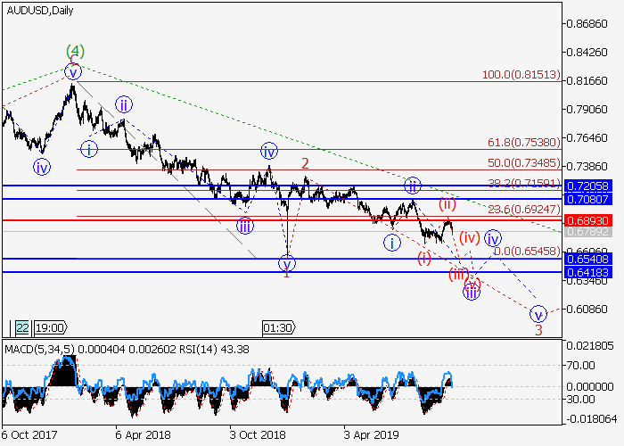 日线图中,(5)的较高水平3的第三波形成,其中3的波iii在发展。目前,上行修正已形成为iii的波(ii),iii的波(iii)已开始发展。如果假设正确,价格将会跌至0.6540–0.6418水平。该情况的关键止损水平为0.6893