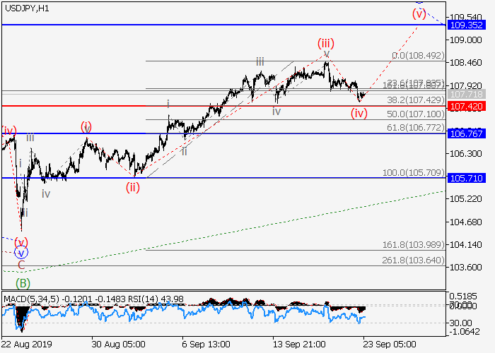4小时图中,1的第一波i在较高水平的起始波(C)中发展。目前,1的i的较低水平(iii)的第三波已形成,i的局部修正(iv)正在结束。如果假设正确,价格将会升至109.35–112.32。该情况的关键止损水平为107.42。