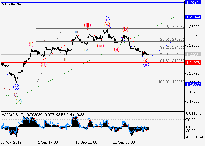 4小时图中,较高水平的下行修正已发展为波(2)的,(2)的波C已结束。目前,较高水平的第三波已开始形成,其中,(3)的1的较低水平i的第一波已形成,下行修正作为1的波ii正在结束发展。如果假设正确,修正结束后,价格将会升至1.2704–1.2867水平。该情况的关键止损水平为1.2197。