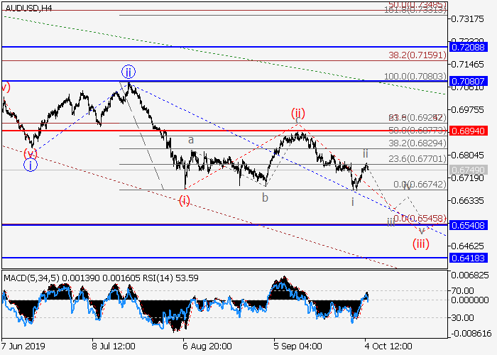 4小时图中,(5)的3的较高水平iii的第三波形成,其中3的iii的波(iii)在发展。目前,(iii)的较低水平i的已形成,(iii)的局部修正ii已结束。如果假设正确,价格将会跌至0.6540–0.6418水平。该情况的关键止损水平为0.6894。