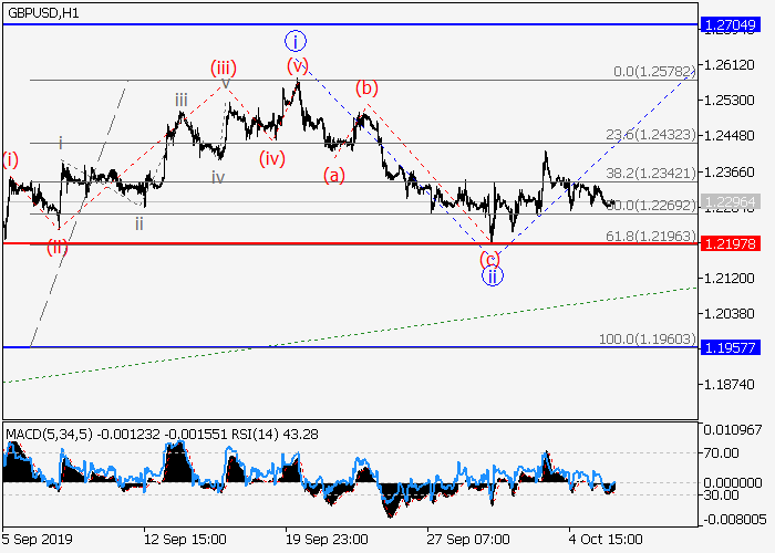 4小时图中,较高水平的下行修正已发展为波(2),其中(2)的波C已结束。目前,较高水平的第三波已开始,其中(3)的1的较低水平i的第一波已形成,下行修正已发展为1的波ii,以达到修正水平62%。如果假设正确,价格将会升至1.2704–1.2867水平。该情况的关键止损水平为1.2197。