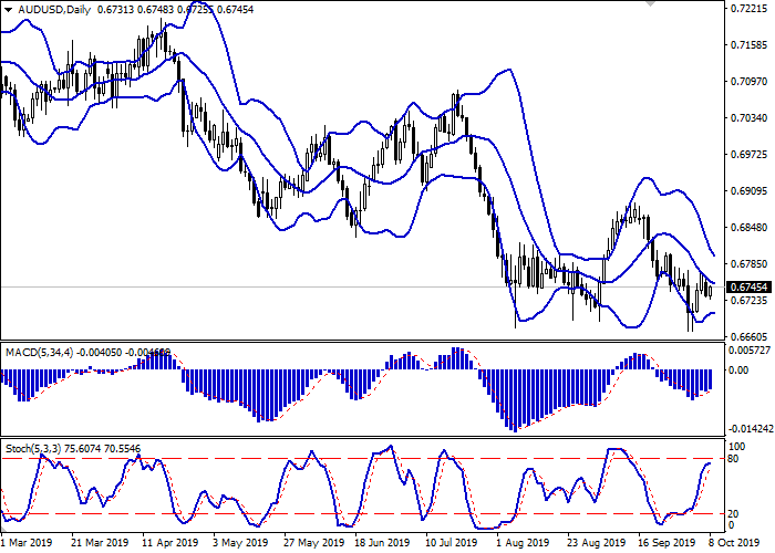 日线图中,布林带水平反转。价格区间收窄,反映出短期内交易多方向动态。平滑异同移动平均线增长,保持适度买入信号(图柱在信号线以上)。随机指标上涨,但接近其高点,表示澳元可能在超短期内出现超买。