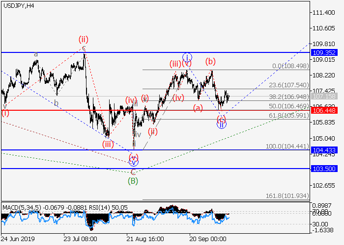 4小时图中,第一波1在已开始的较高水平的波(C)中发展。目前,(C)的1的较低水平i的第一波已形成,1的局部修正ii已结束,已达到50%修正水平。如果假设正确,价格将会升至109.35–112.32水平。该情况的关键止损水平为106.44。