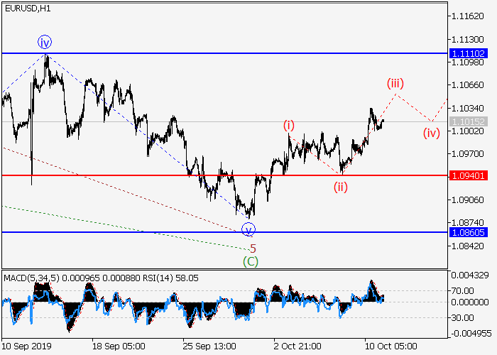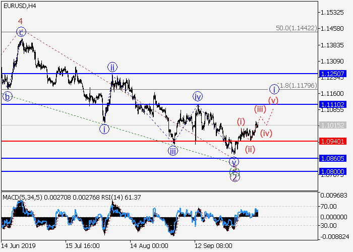 4小时图中,较高水平的下行修正已发展为波2,其中2的(C)的第五波5已形成。目前,第三波3正开始发展,其中3的(1)的1的较低水平i的第一波正在形成。如果假设正确,价格将会升至1.1110–1.1250水平。该情况的关键止损水平为1.0940。