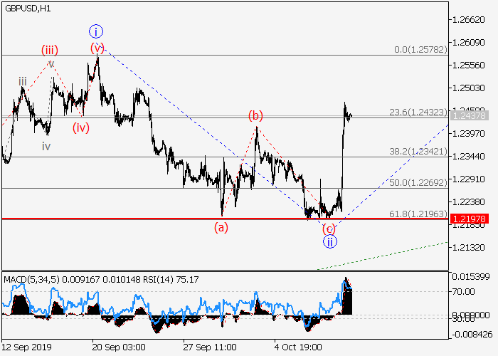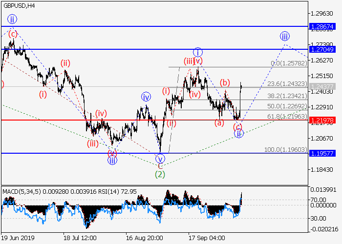 4小时图中,较高水平的下行修正已发展为波(2),第三波(3)已开始。目前,(3)的1的较低水平i的第一波已形成,下行修正已发展为1的波ii,以达到62%修正水平。如果假设正确,价格将会升至1.2704–1.2867水平。该情况的关键止损水平为1.2197。