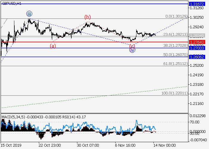 4小时图中,较高水平的下行修正已发展为波(2),第三波(3)已开始形成。目前,(3)的较低水平1的第一波正在形成,其中1的较低水平iii的第三波已形成,下行修正已结束为1的波iv。如果假设正确,价格将会在1的波v内,升至1.3167–1.3387。该情况的关键止损水平为1.2764。